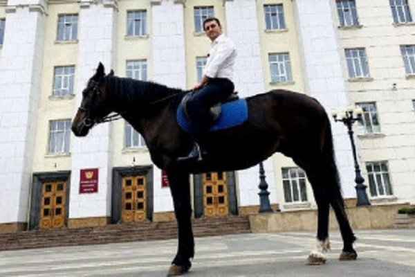 Евгений Федяев на коне у здания правительства области. Фото t.me/fedyaev_evgenij