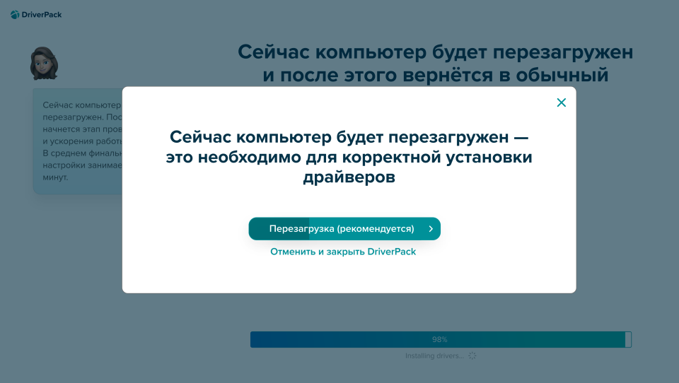 В первом случае пользователю ничего не нужно делать – сайт автоматически просканирует операционную систему и подберет необходимые драйверы. Просто ответьте на несколько простых вопросов и дождитесь завершения процесса. По окончании инсталляции система предложит перезагрузить компьютер – для этого достаточно нажать кнопку в специальном окне, пример представлен ниже.
