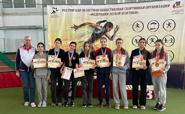 Легкоатлетки вместе со своим тренером на стартах в Шахтах. Фото ДЮСШ №2 в соцсети «ВКонтакте»