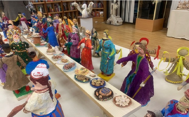 Каждая фигурка изготовлена из проволочного каркаса, фольги, папье-маше и вручную расписана акрилом. Угощения сделали из дерева и керамики.