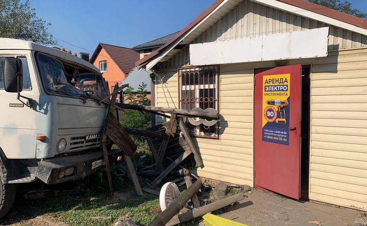 В посёлке Овощной Азовского района «Камаз» сорвался с ручного тормоза и врезался в магазин электроинструментов. Об этом сообщили очевидцы в telegram–канале «Азов События».