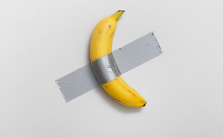 Произведение современного искусства под названием «Комедиант» итальянского художника Маурицио Каттелана продали на торгах аукционного дома Sotheby's за $6,24 млн. Оно представляет собой банан, приклеенный к стене серым скотчем.