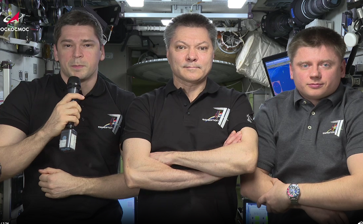 Николай Чуб, Олег Кононенко и Александр Гребёнкиню. Скриншот видеозаписи telegram-канала госкорпорации «Роскосмос»