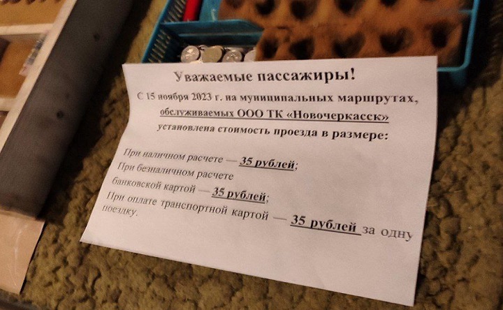 В новочеркасских автобусах появились объявления о повышении стоимости проезда. Цена одной поездки вырастет на 5 рублей с 15 ноября, при этом способ оплаты значения иметь не будет — рассчитываясь наличными, банковской или транспортной картой, пассажиры должны будут заплатить фиксированную сумму — 35 рублей.