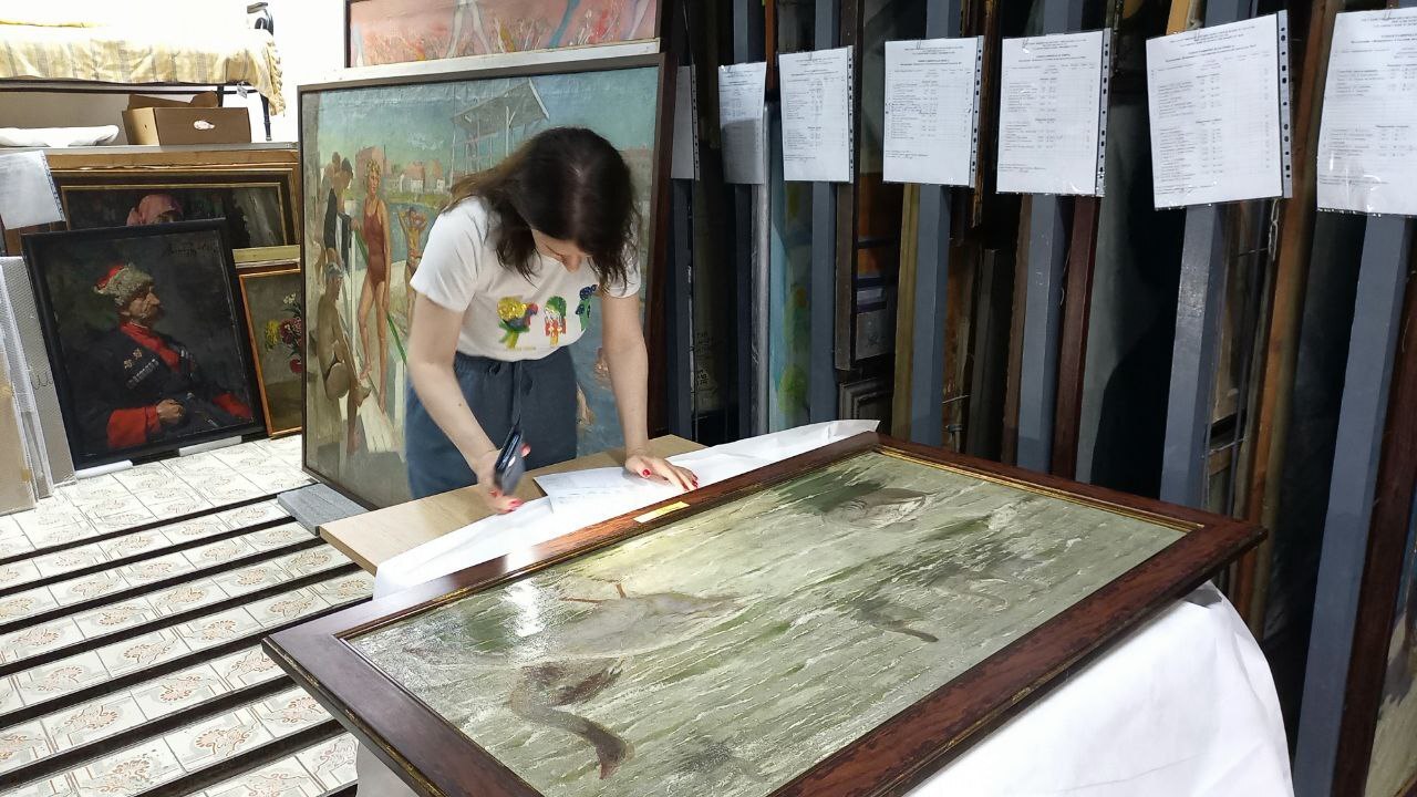 Сотрудники фондохранилища Таганрогского художественного музея приняли ценные полотна, предварительно тщательно проверив их сохранность после транспортировки.