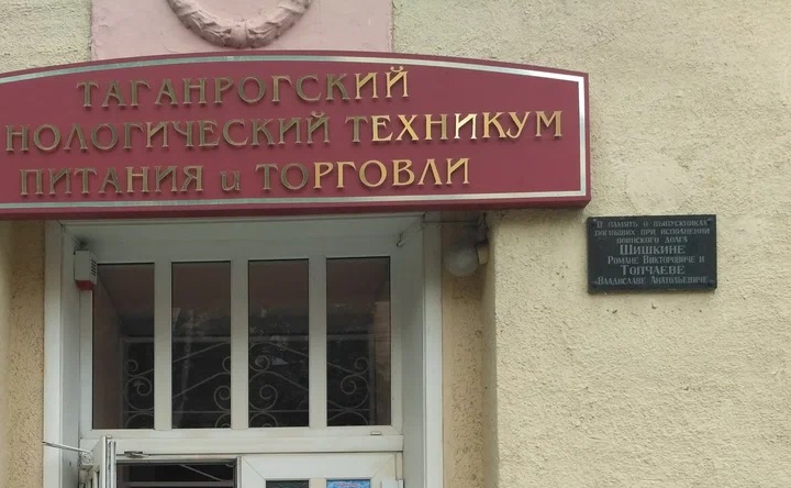 Мемориальная табличка на фасаде техникума. Фото Таганрогского технологического техникума питания и торговли