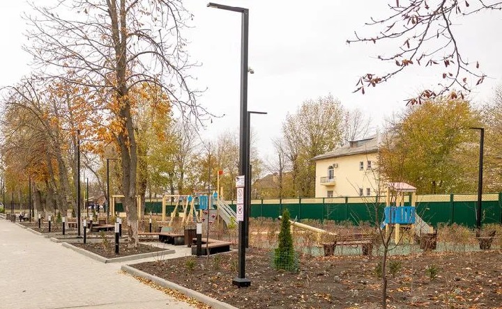 На территории ДК «Фестивального» в Таганроге завершились все этапы благоустройства. Здесь полностью заменили асфальтовое покрытие, уложили новую плитку, смонтировали ограждения. С нуля установили систему разноуровневого освещения. Но главное — на месте полуразрушенной детской площадки появился современный игровой комплекс с травмобезопасным покрытием.