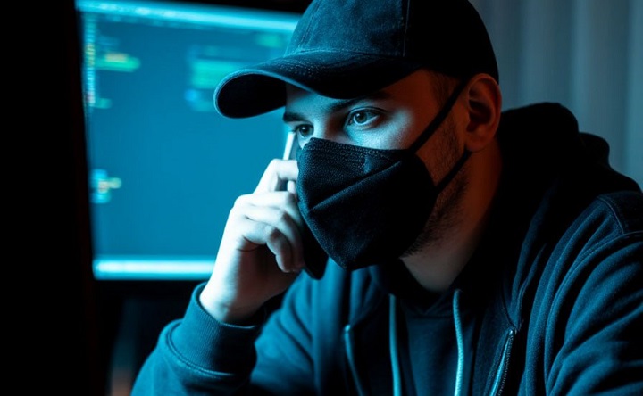 Мужчина в маске с телефоном. Фото для иллюстрации пресс-службы регионального МВД