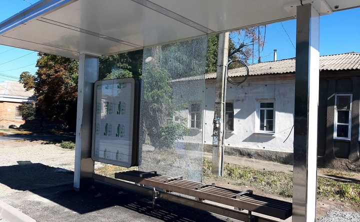 Разбитое стекло в остановочном павильоне. Фото Олега Кобякова