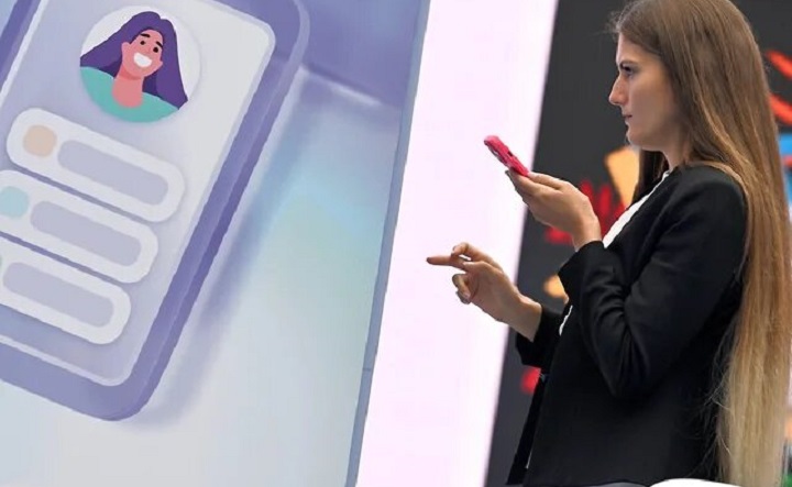 Девушка у информационного стенда платформы «Сферум». Фото Александра Миридонова, «Коммерсантъ»