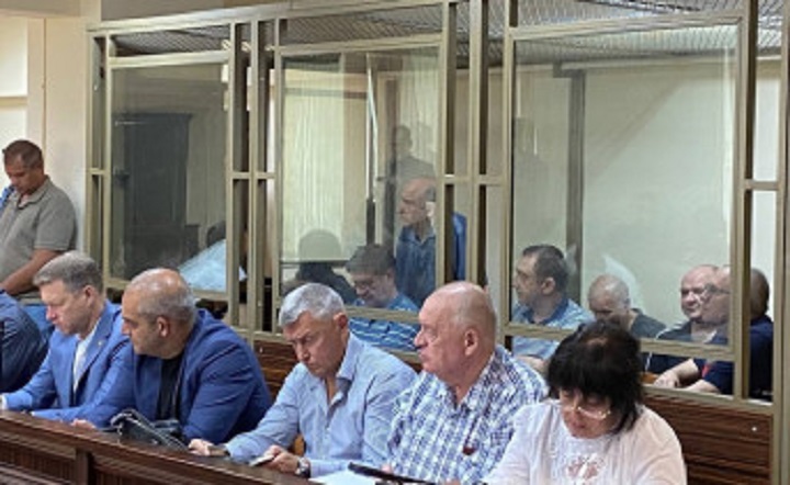 Адвокаты (на первом плане) и обвиняемые в (в клетке ) в суде. Фото donnews.ru.