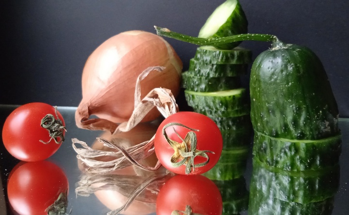 Томаты, лук и огурцы. Фото Сергея Студеникина