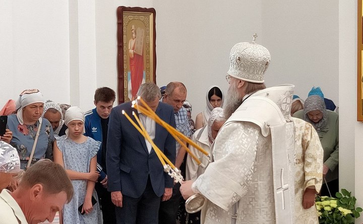 Освятить новый храм решили 2 июня 2024 года. На таинстве присутствовали глава администрации Азовского района Александр Палатный и прихожане. Жители района, впервые побывавшие в восстановленной церкви, поделились впечатлениями: «Величественный храм и неожиданно, что в таком небольшом селе», «Очень удачное место для храма, его видно за многие километры», «Храм завораживает, притягивает своей белизной и чистотой, впечатлил купол, похожий на шлемы русских витязей».
