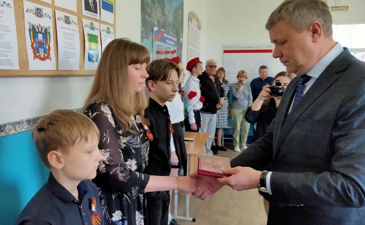 Глава администрации Азовского района Александр Палатный передал награду вдове Владимира Белова Светлане и его сыновьям Ивану и Николаю.