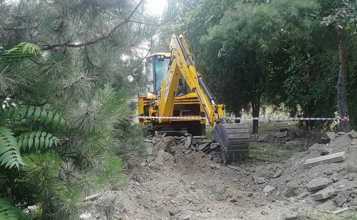 В Азове в сквере Лётчикам на пересечении улиц Московской и Красногоровской появилась строительная техника. Подрядчик — ООО «СпецСтрой», уже снял старую тротуарную плитку и почти очистил тротуары от асфальтового покрытия.