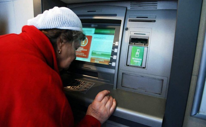 Пенсионерка проверяет баланс карты в банкомате. Фото yur–gazeta.ru