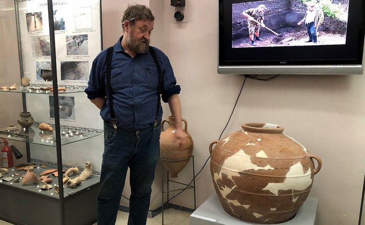 Завотделом археологии музея Андрей Масловский рассказывает о найденной корчаге. Фото t.me/azovmuseum
