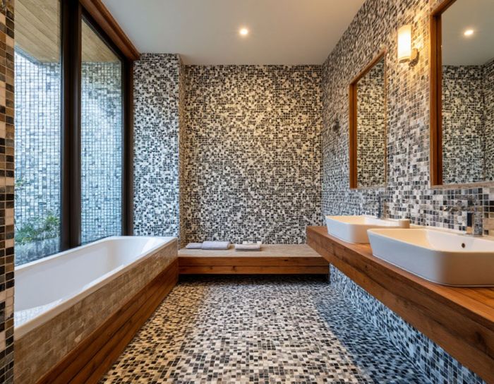 Мозаика позволяет создавать бесшовные переходы цвета, имитировать натуральные материалы (мрамор, камень, дерево), а также встраивать LED-подсветку, инкрустации и 3D-элементы. Это делает её незаменимой для создания уникального дизайна ванных комнат и спа-зон.