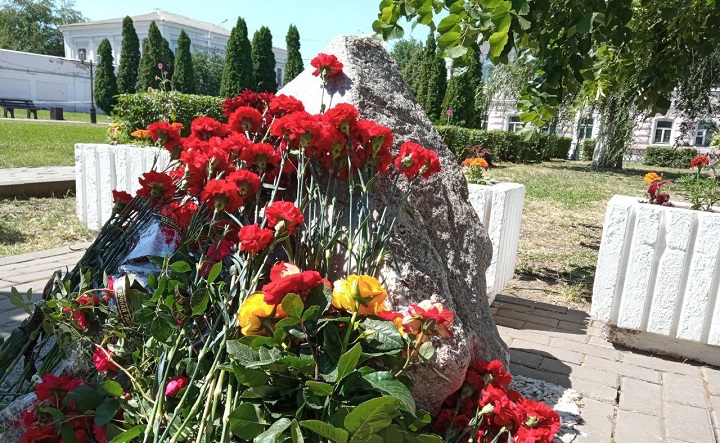 Цветы у памятного камня. Фото Валентины Вавилиной