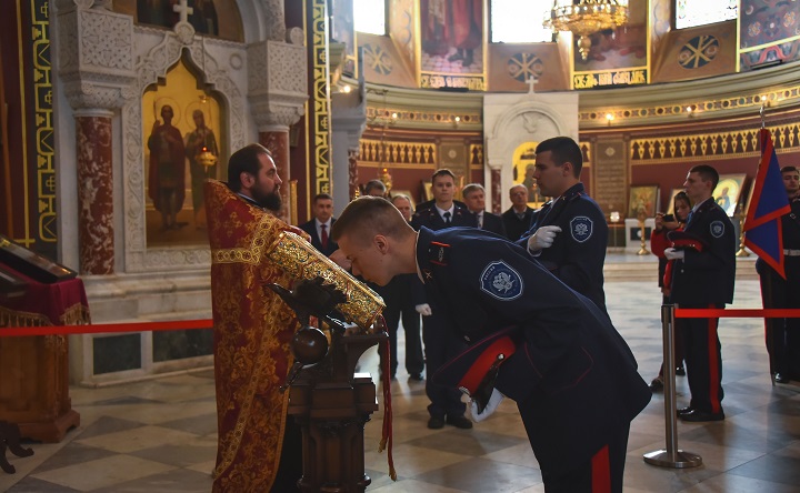 Поздравить юных казаков с вступлением на поприще службы, пришли преподаватели и студенты политеха, а также представители 9-ти войсковых казачьих обществ, которые участвуют с стратегической сессии. Перед началом церемонии духовник Всевеликого войска Донского протоиерей Георгий Сморкалов провёл молебен, благословил и окропил святой водой казаков-новобранцев.