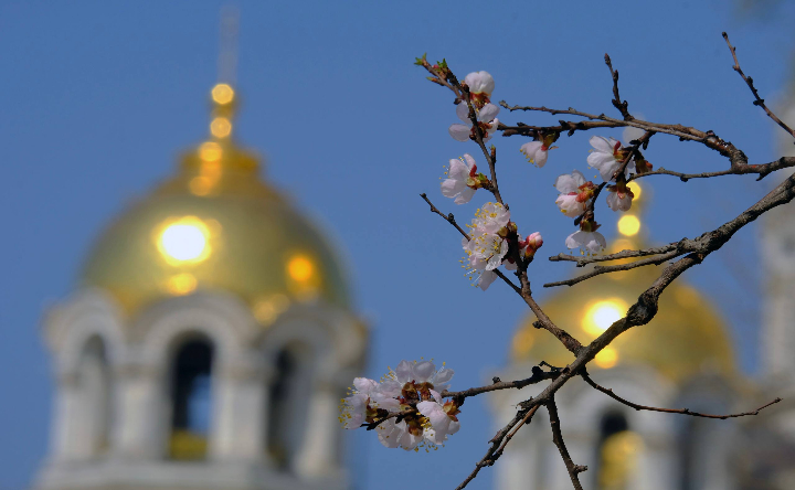 Цветущая ветка абрикоса на фоне Вознесенского собора в Новочеркасске. Фото Никиты Сиденина