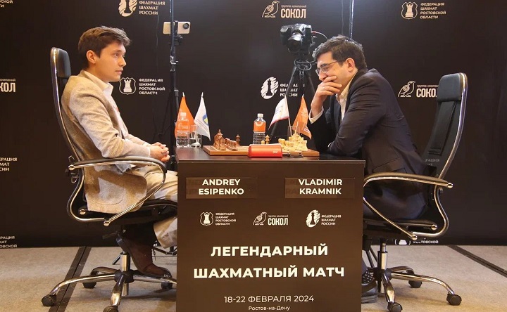 «Матч дружбы» между международным гроссмейстером из Новочеркасска, лидером российских молодых шахматистов, Андреем Есипенко и экс-чемпионом мира Владимиром Крамником, который проходил в Ростове, пришлось прервать из-за болезни последнего.