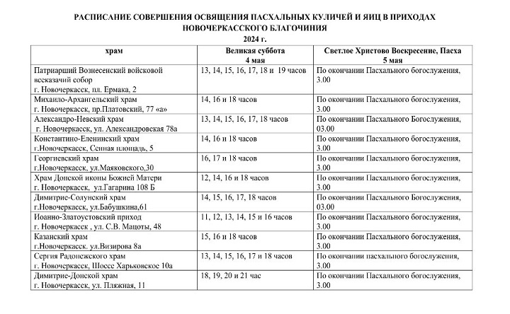 Во всех православных храмах Новочеркасска праздничные богослужения начнутся в 21:00 4 мая, накануне одного из самых почитаемых христианских праздников, а завершатся в 4:00 5 мая. В Вознесенском соборе в 23:00 проведут Крестный ход, в полночь начнётся пасхальная божественная литургия. Ознакомиться с подробным расписанием богослужений в остальных храмах можно на сайте новочеркасского благочиния.