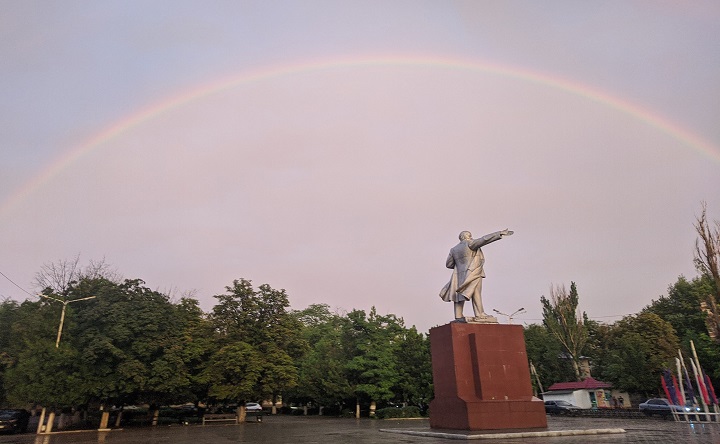 Радуга над площадью перед ДК микрорайона Октябрьского. Фото vk.com/novocherckasskiycasual