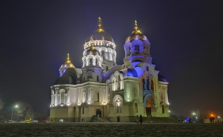 4 дня во время новогодних каникул вечерние прогулки можно посвятить любованию световыми проекциями на фасаде Патриаршего Вознесенского войскового всеказачьего собора в Новочеркасске.