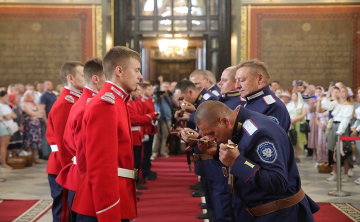 В верхнем храме Вознесенского собора казакам-участникам конного перехода, посвящённого Матвею Платову, вручили именное наградное клинковое оружие. На торжественную церемонию собрались атаманы казачьих округов, студенты казачьей сотни ЮРГПУ (НПИ), кадеты и прихожане храма. Казачьи шашки, по традиции, окропили святой водой.