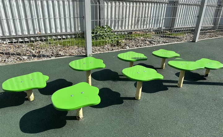 На спортивной площадке резиновое покрытие, также установили забор по периметру и спортивно-игровое оборудование для детей: пеньки «Лягушонок», мишени, спортивный комплекс «Полоса препятствий», волейбольные и баскетбольные стойки.