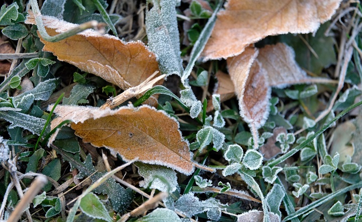Трава и опавшие листья в инее. Фото Никиты Сиденина