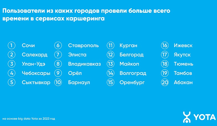 2023 году дольше всего сервисами для каршеринга в среднем пользовались абоненты из Сочи, Салехарда, Улан-Удэ и Чебоксар. Больше всего гигабайт в среднем тратили пользователи из Чебоксар, Элисты, Смоленска, Тамбова и Саранска.