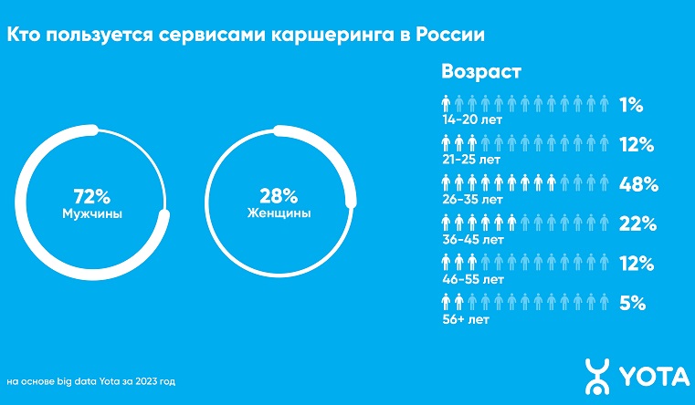 Большинство пользователей каршеринговых сервисов — мужчины (72%). Однако именно женская аудитория обеспечила основной прирост интернет-трафика таких приложений в 2023 году (+16%).