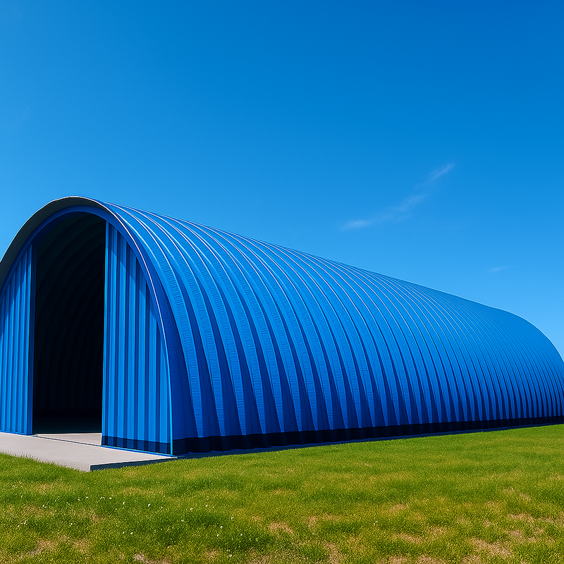 Арочные ангары — один из самых доступных вариантов. Минимальный расход металла, отсутствие сложного каркаса и быстрый монтаж делают их выгодными для складов, сенохранилищ и сельхозтехники.