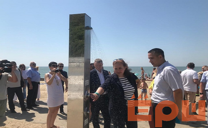 Инна Титаренко проверяет работу душа на пляже. Фото ruffnews.ru
