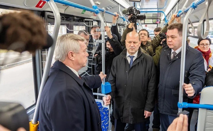 Губернатор Василий Голубев в таганрогском электробусе. Фото пресс-службы администрации Таганрога