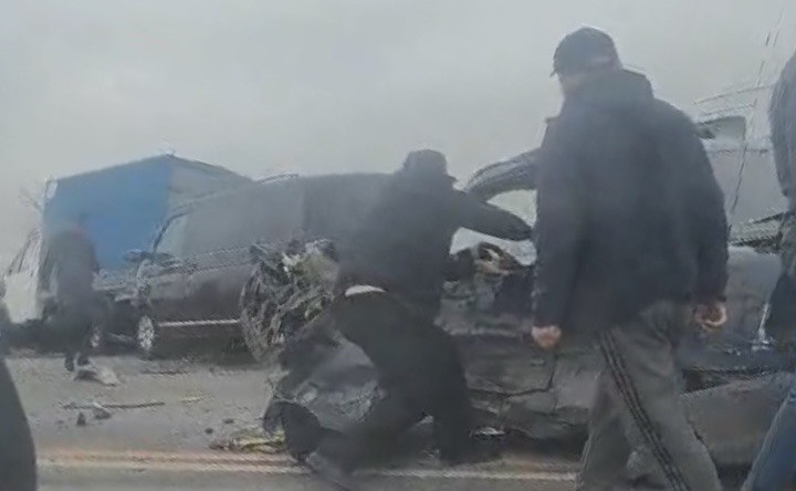 Свидетели ДТП пытаются помочь заблокированному водителю. Скриншот видео telegram-канала «Водители Таганрога»