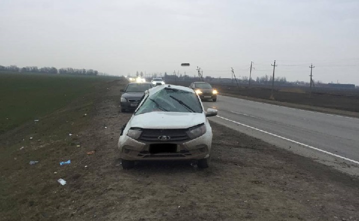 Перевернувшаяся Lada Granta. Фото пресс-службы Госавтоинспекции Ростовской области