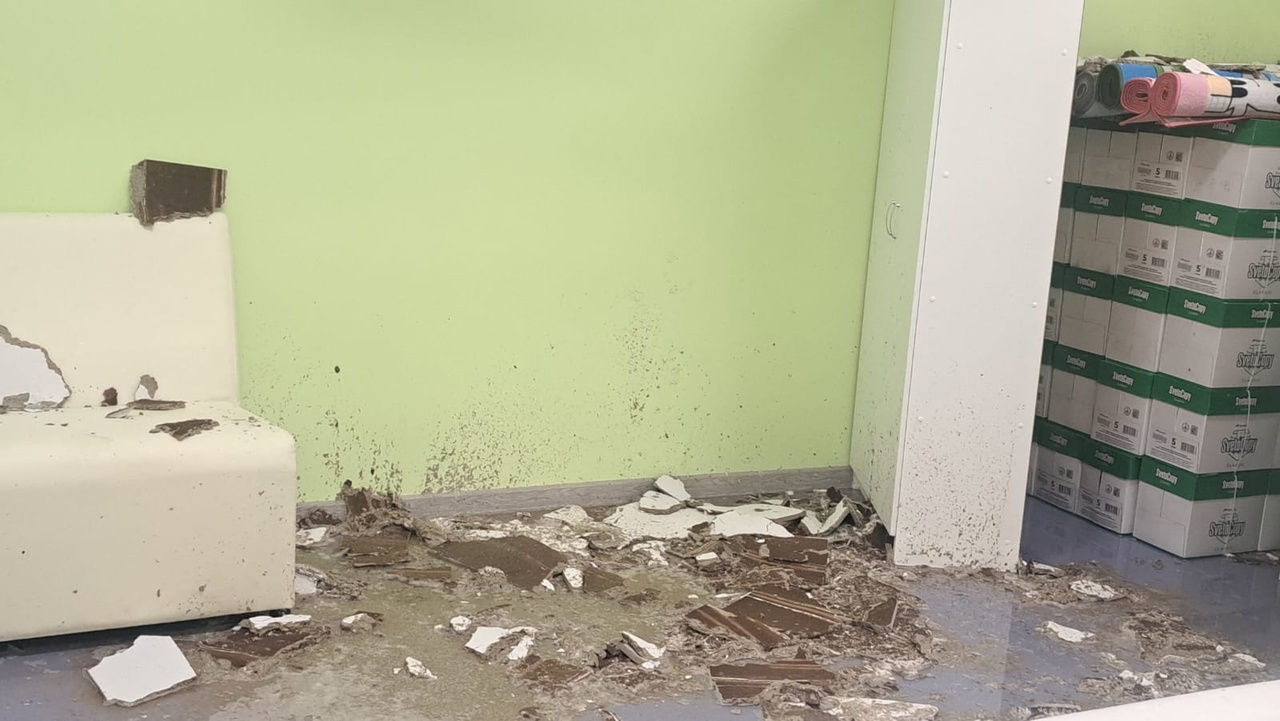 Поликлиника располагается на первом этаже пятиэтажного дома. Журналист «Ёрш. Таганрог» побывал в помещении детского медучреждния, пострадавший от залития кабинет закрыт. Медперсонал подтвердил обрушение потолка, но отказался комментировать ситуацию.
